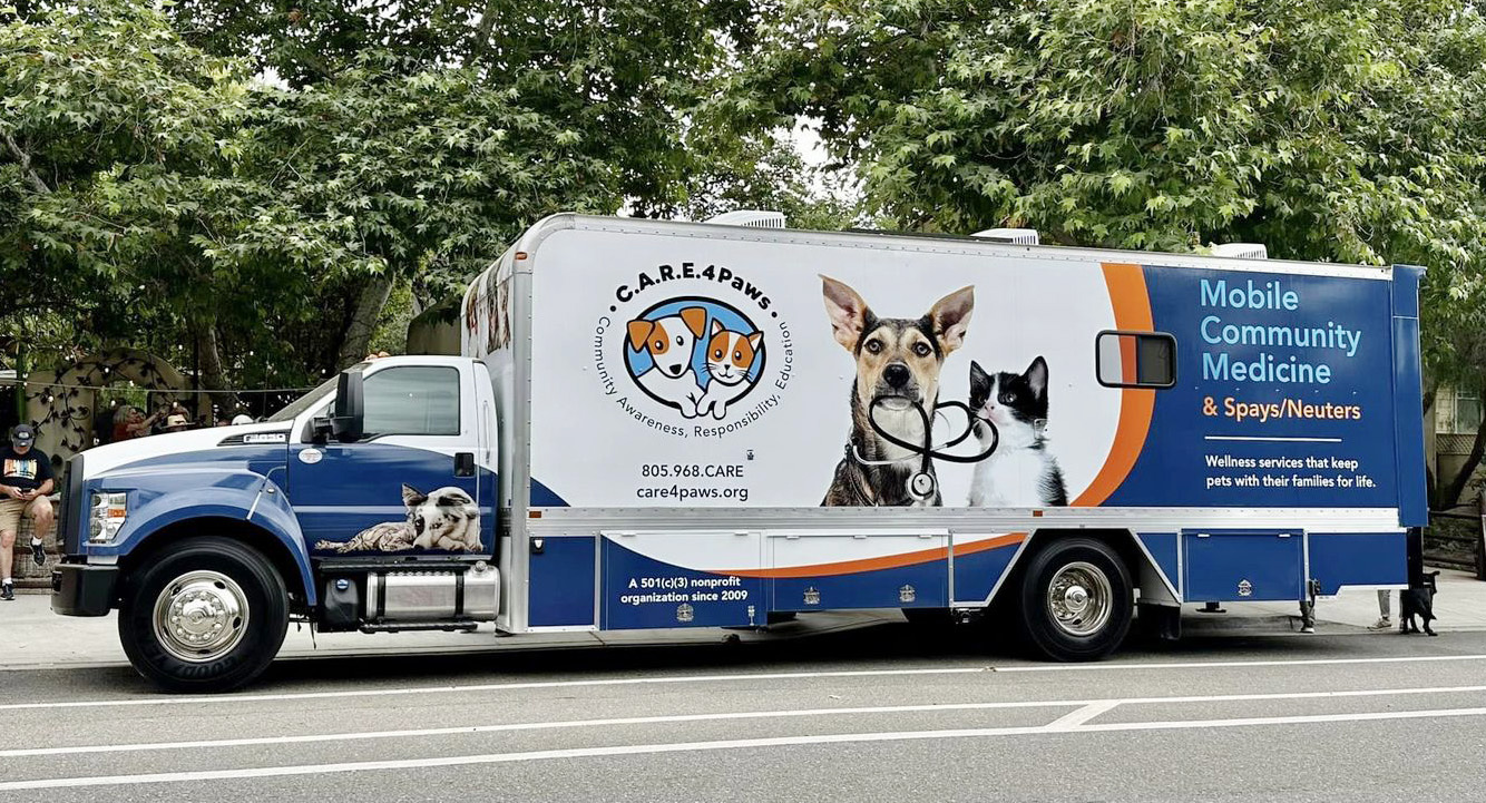 The mobile clinic is CARE4Paws’ largest program, operating throughout the County, with a consistent appearance in Santa Barbara, Santa Maria, Lompoc, and Grover Beach and frequent service in other locations, including parts of S.L.O. County. The nonprofit’s aim is to ensure that neither cost nor transportation are barriers to pets receiving care. The clinics are staffed by paid veterinarians and technicians and a volunteer team.