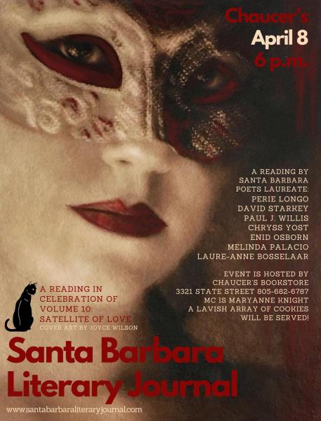 The following Monday night (April 8 at 6 p.m. — is Monday the new Thursday?), Chaucer’s is hosting a special evening with the Santa Barbara Literary Journal promoting Volume 10: Satellite of Love and featuring poetry readings by Poet Laureates Perie Longo, David Starkey, Paul J. Willis, Chryss Yost, Enid Osborn, Melinda Palacio, and Laure-Anne Bosselaar, as well as featured poetry from the late Sojourner Kincaid Rolle, who was a beloved Santa Barbara Poet Laureate.