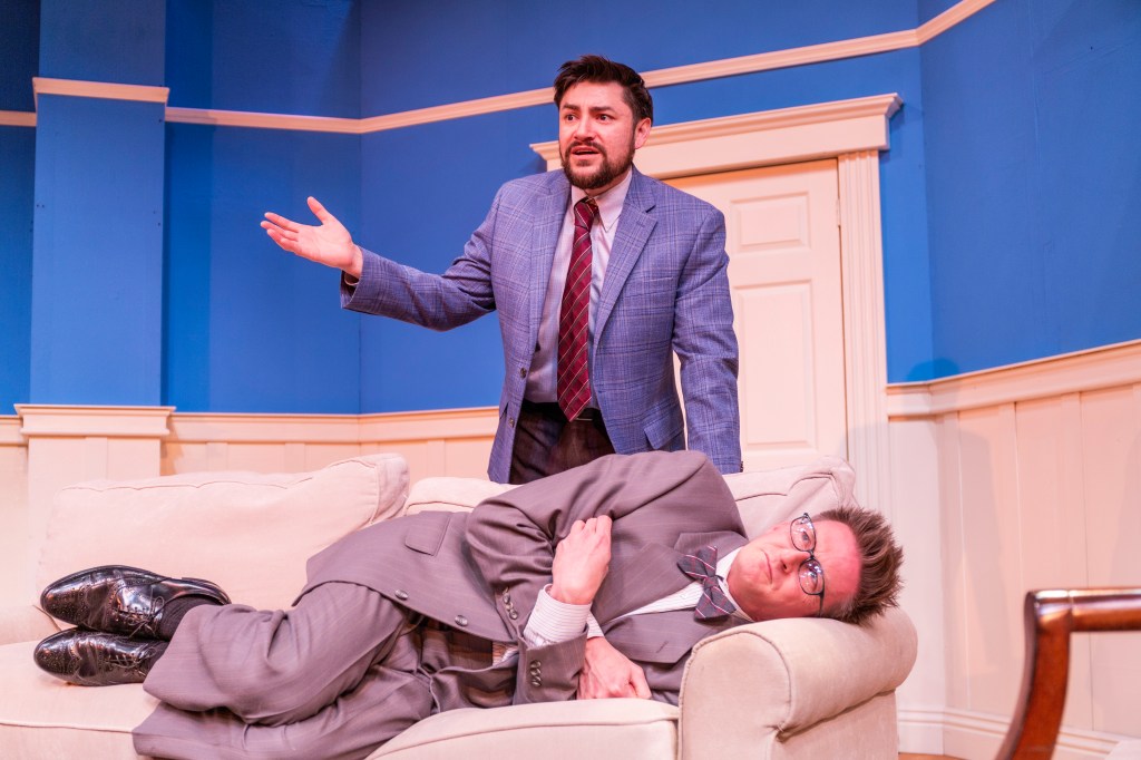 The Outsider, by Paul Slade Smith, is a political comedy that follows a shy, policy-enthusiast lieutenant governor thrust into the spotlight when his predecessor resigns in disgrace. Ned Newley, played by Justin Stark on the Jurkowitz stage at Santa Barbara City College, is interested in behind-the-scenes government. He’s perpetually anxious around cameras, the press, and the public, but he knows he can make positive change behind closed doors. Newley’s loyal chief of staff, Dave Riley (played by Nicholis Sheley), takes on the challenge of keeping Newley in office.