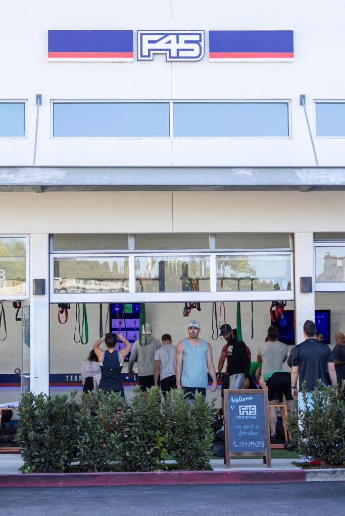 I didn’t manage to connect with Alexis, but I never forgot her enthusiasm. That’s how I found myself at the F45 in downtown Santa Barbara one evening. I nabbed the last space in the small parking lot they share with Dune Coffee Roasters and walked through the open roll-up doors that make up the front wall of the studio. Coach Bolden greeted me with a brief orientation, then got class started by welcoming new members, explaining the “pods” (circuits) of the day’s workout while another coach demonstrated each exercise, and assigned each of us a starting station. Video monitors on the wall led us through a warmup. The monitors also showed video of each exercise, count down work time and rest time, prompt you when it’s time to change stations, and announce water breaks. Each class wraps up with a brief round of core work led by a coach.