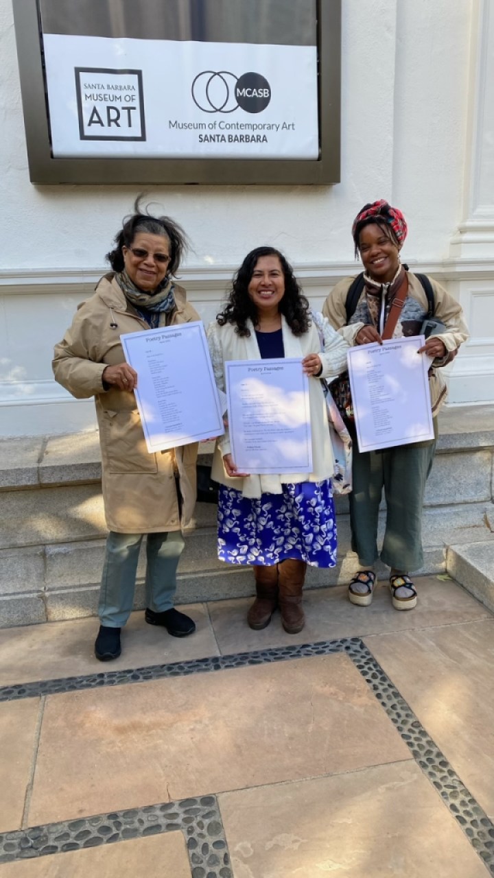 As a co-organizer for Poetry Passages, the project to put poems on our city buses, I was a little worried the day of the event. We hoped for a nice day for our outdoor event, especially since the Santa Barbara Museum of Art offered to host us on the Museum’s front terrace. My co-planner Lea Williams and I were very excited about an outdoor launch party because it meant people celebrating First Thursday might stop and learn about the project and poetry month.