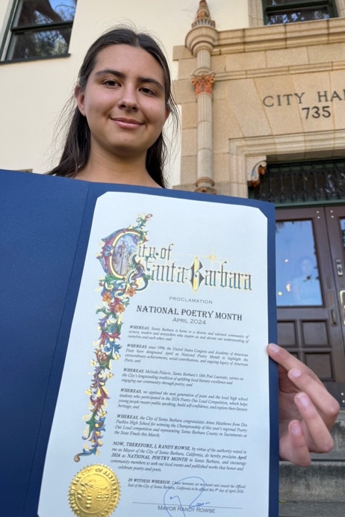 Santa Barbara Mayor Randy Rowse offered a proclamation for National Poetry Month on Tuesday, April 9, at the City Council meeting. As part of the ceremony, Dos Pueblos High School student Anna Matthews recited her award-winning performance of “The Listeners” by Robert Frost. She is the regional champion of the Poetry Out Loud Competition.