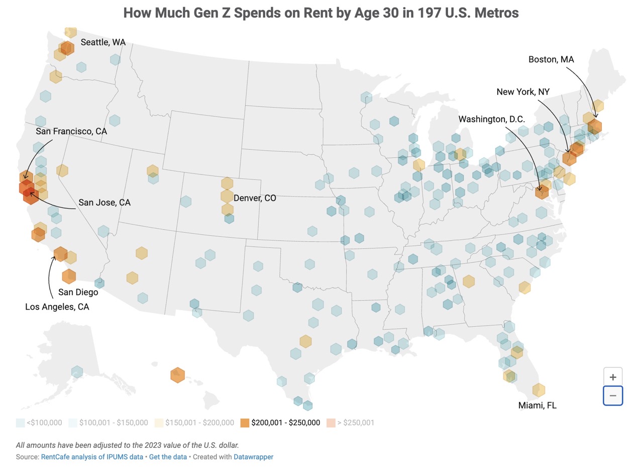 According to RentCafe, renting for Gen Z in Santa Barbara is a “no-brainer.” Although they pay lower rental expenses than in California’s most expensive cities, they still exceed the national average and other nearby cities like San Luis Obispo, where Gen Z is expected to spend $197,000 on rent by age 30.