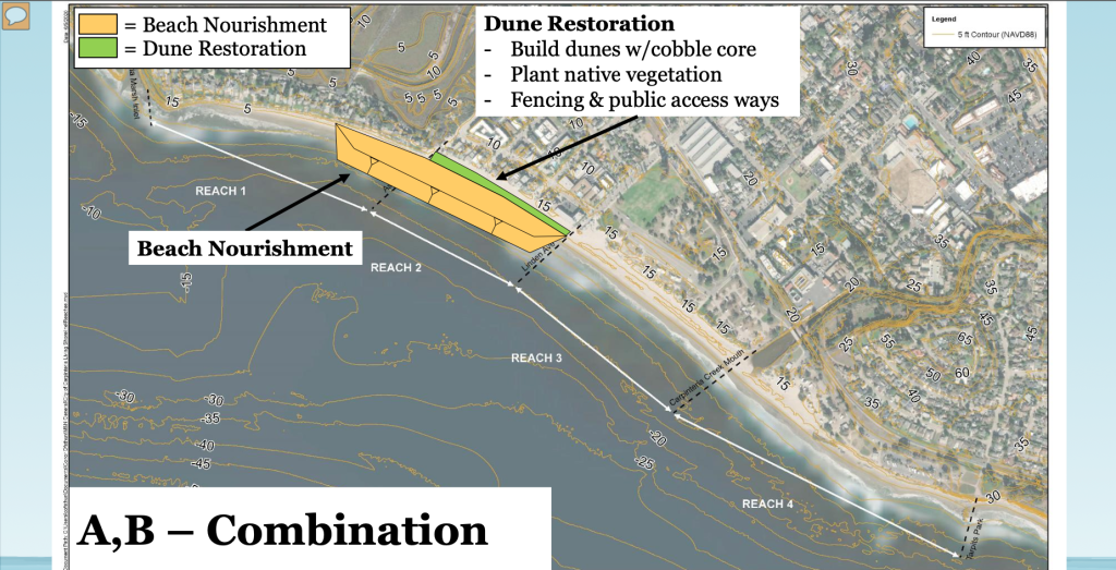 The low-lying Carpinteria City Beach, surrounding beach neighborhoods, and downtown area lack any hardened coastal armoring, leaving them exposed to escalating climate change impacts. The Living Shoreline Project will implement a sustainable, nature-based solution along the city beach using “living” elements like vegetation and sand to provide resilient shoreline protection.
