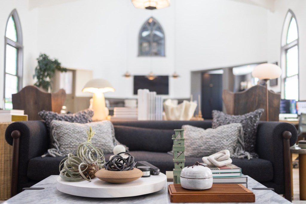 Opened last spring, Ministry of the Interior is an airy, arched-ceiling space with dramatic new trusses and custom art-deco chandeliers that serves as both a studio for Brown Design Group (his office occupies the former rectory) and a showroom of vintage and contemporary home accessories, ceramics, books, and art (with stairs leading up to the choir loft).