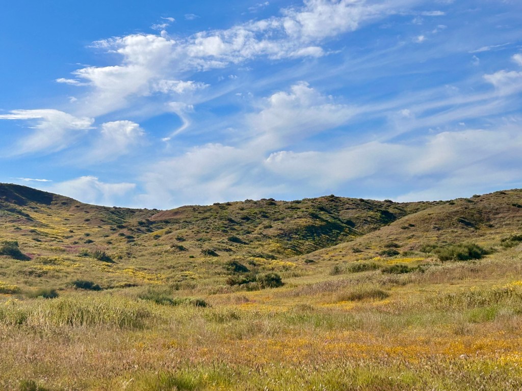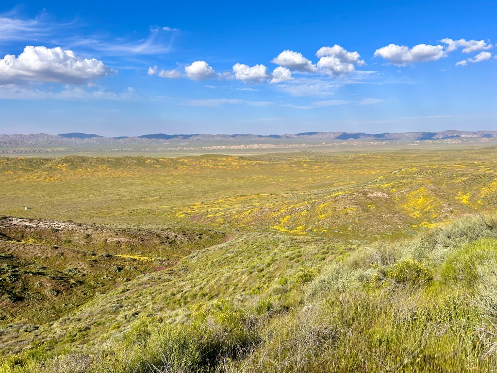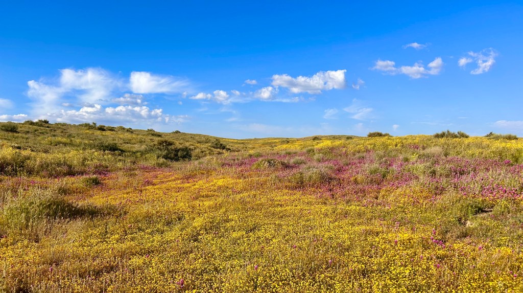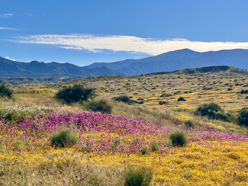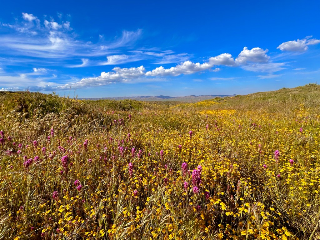 At 38 miles long and 17 miles wide, the Carrizo Plain is surrounded by mountains and bisected by the San Andreas Fault, whose influence is seen in the landscape. We were greeted with layers of undulating hills and fields of wildflowers. While not exactly the neon rainbows that you may have seen online, there was plenty of color. Throughout the day we observed poppies, lupine, yellow fiddlenecks, and miles of goldfields dotted with purple owl’s clover. We also encountered fields of tidy tips, and the brashly named common hillside daisies, which looked anything but common to me.