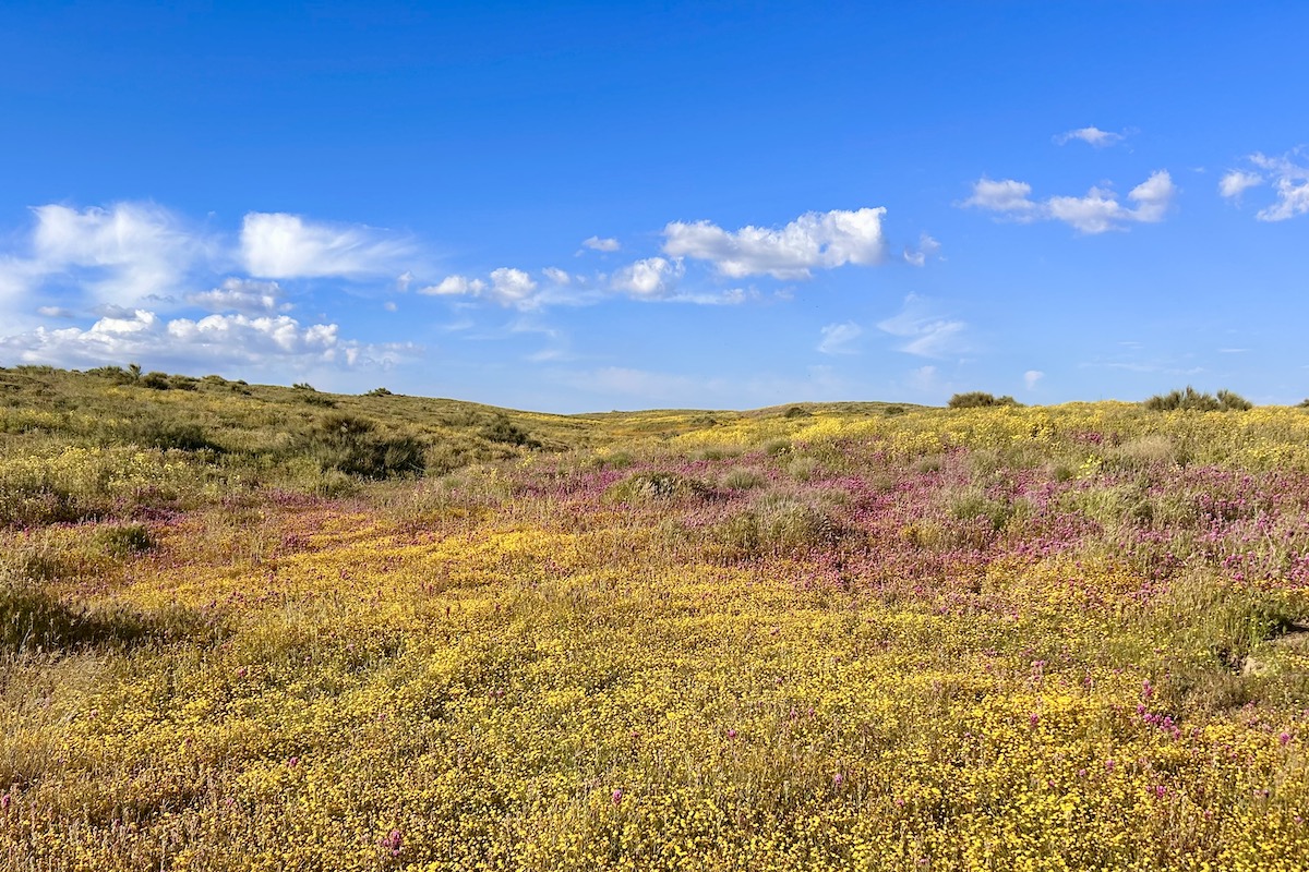 At 38 miles long and 17 miles wide, the Carrizo Plain is surrounded by mountains and bisected by the San Andreas Fault, whose influence is seen in the landscape. We were greeted with layers of undulating hills and fields of wildflowers. While not exactly the neon rainbows that you may have seen online, there was plenty of color. Throughout the day we observed poppies, lupine, yellow fiddlenecks, and miles of goldfields dotted with purple owl’s clover. We also encountered fields of tidy tips, and the brashly named common hillside daisies, which looked anything but common to me.