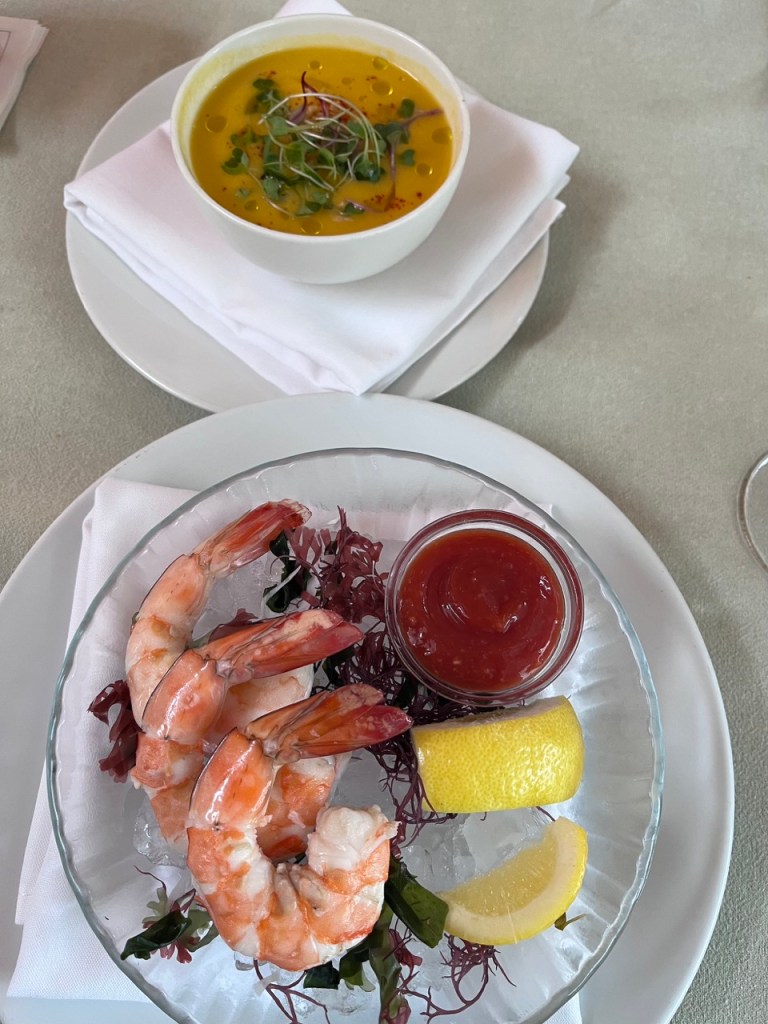 Starters include the choice of organic mixed greens, jumbo shrimp cocktail, or a Tuscan melon and yellow tomato gazpacho, which my friend said was excellent. For dessert, we both went for the San Ysidro Ranch Meyer lemon tart, which was dreamy indeed.
