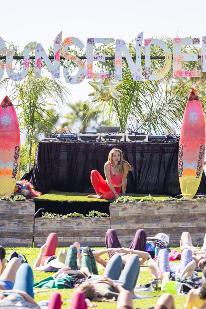 After some brief welcoming remarks and an emotional thanks to the team that helped make Sunsender a reality, Smith led us through a challenging but playful yoga practice — making kissy faces at our neighbors, wagging our booties in chair pose, doing frog kicks and handstands. At the end, she had us do backbends and say hello to the person we were facing. I greeted a glamorous woman in animal-print tights. “This is hard,” I said, and she agreed. “Good job,” we told each other. After the yoga, the festival vibe really kicked in, with young women in diaphanous dusters dancing to the deejay sets by Origami Human and Shallou that followed.