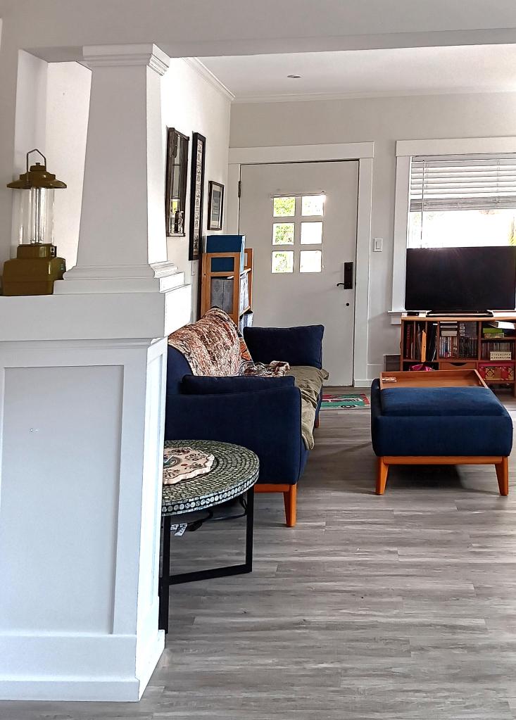When I opened the gate and got my first view of the home, I was pleased to see that the exterior blended seamlessly with the gate. Inside the home, the squared, tapered columns in the living room also echoed the same clean-lined Craftsman style.