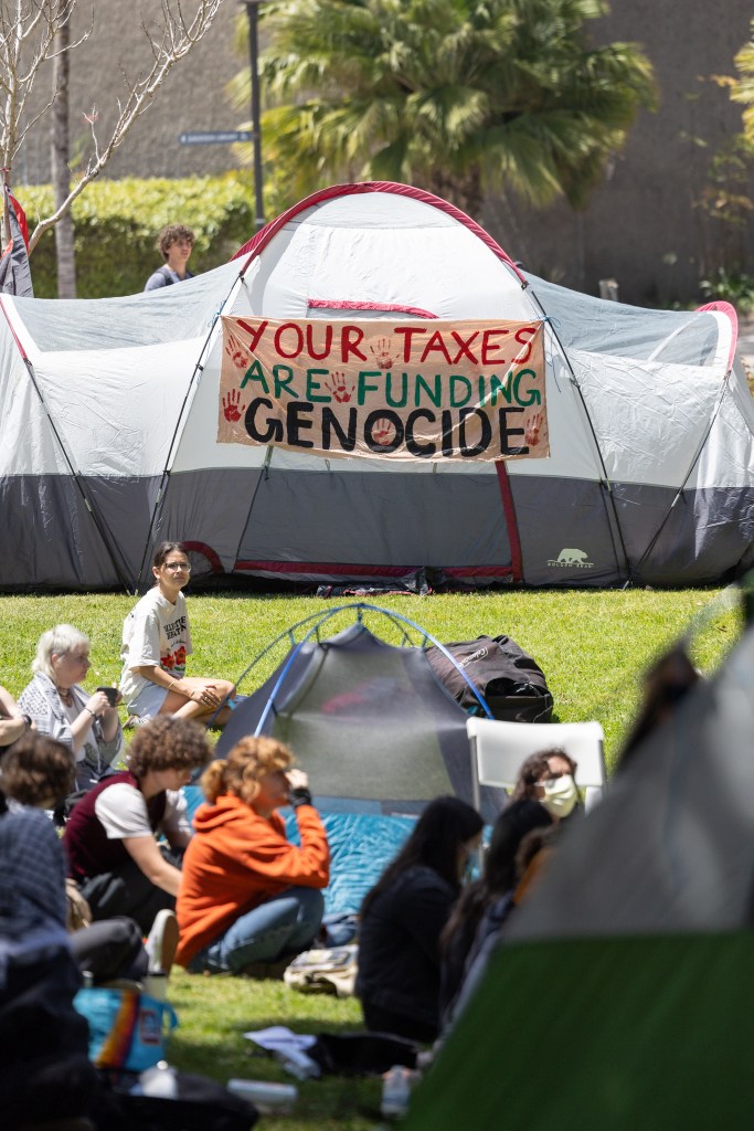 It has been more than two weeks since the first tents of UC Santa Barbara’s student-organized “Liberated Zone” were constructed on UCSB’s campus, just adjacent to Davidson Library and North Hall. In the early morning hours of May 1, just after 4 a.m., organizers erected a few tents, banners, and posters in solidarity with Gaza and protesting against UCSB’s investments in the military-defense industry.