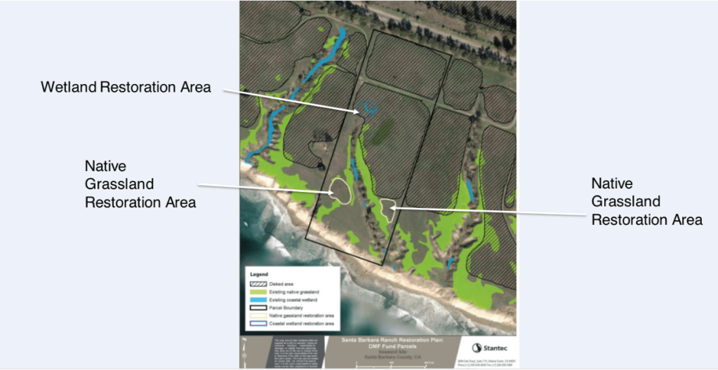 According to the project’s restoration plan, “The development proposal footprint was designed to avoid impacts on native grassland and wetland resources and associated buffers that were documented on the property and detailed in the 2016 Biological Resources Assessment for the Santa Barbara Ranch Project.”
