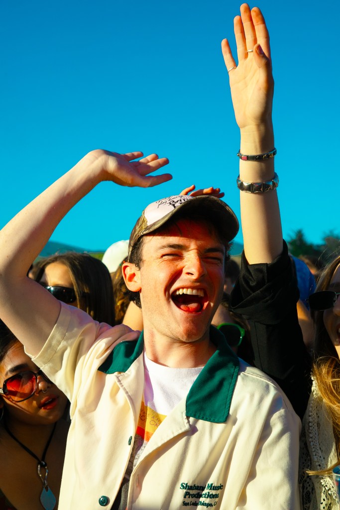 The second day, the weather did indeed flip a switch and rain came misting in. The cool night air decided to stick around, seemingly with FOMO. Still, the festival staff and attendees were not backing down. Goers trudged the eight-minute walk once more, from the parking lot to the grounds, this time dressed in ponchos, jackets, and hats, and holding umbrellas. Tents lined the Cuesta Ridge stage to protect performers and their equipment from the atmospheric conditions.
