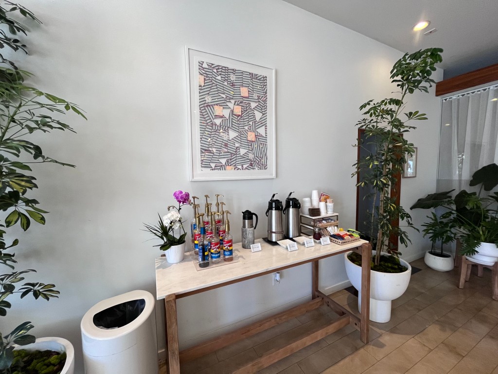 The front lobby space is also a nice place to relax, with a good assortment of teas and coffees available. There are also open-air lounges, as well as an art gallery curated in partnership with the Museum of Contemporary Art Santa Barbara. The current show on view is Changing Nature” featuring recent works by local artists Stephanie Dotson and Madeleine Ignon.