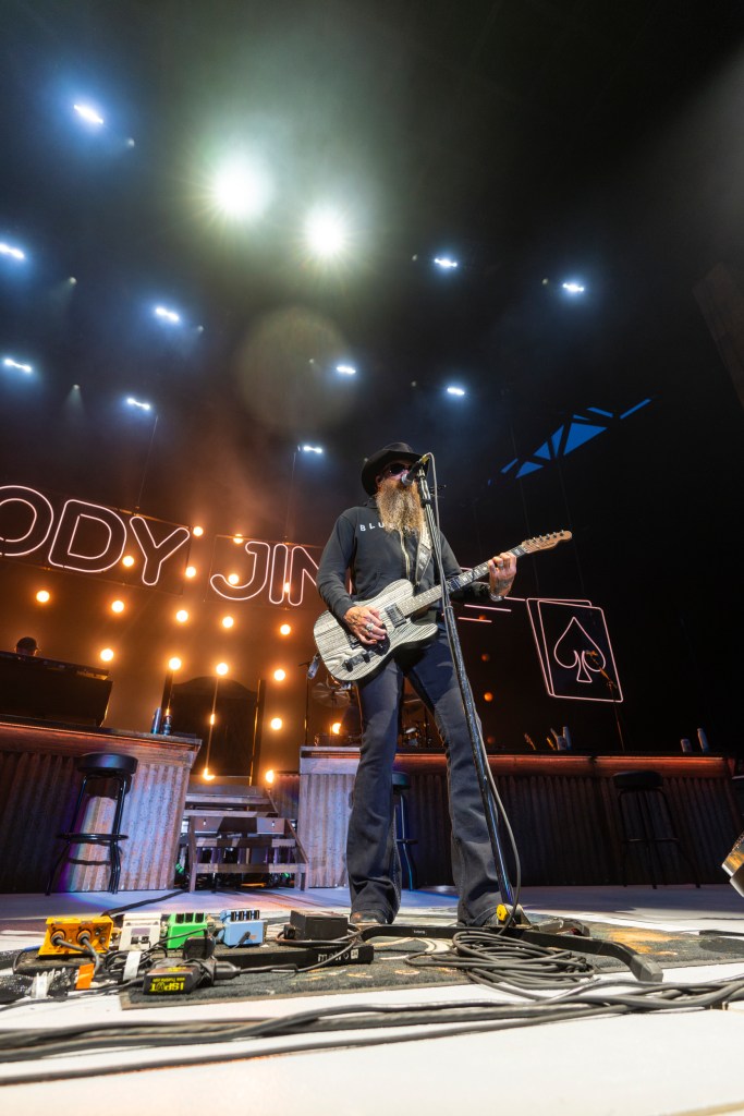 Crew continued to transform the stage, complete with a long bar, high stools, and saloon doors. By eight o’clock, the empty seats were filled and stage lights spelled “Cody Jinks,” along with a neon “Open” sign and an outline of a large spade card, a nod to his tour for his new album, Change the Game. Cody Jinks opened with his song “Holy Water” from the 2018 album, Lifers. The song, about self-improvement, saying he needs a shot of holy water to chase down his demons represents a strong theme in Cody’s repertoire. The singer-songwriter says he gave up drinking altogether.