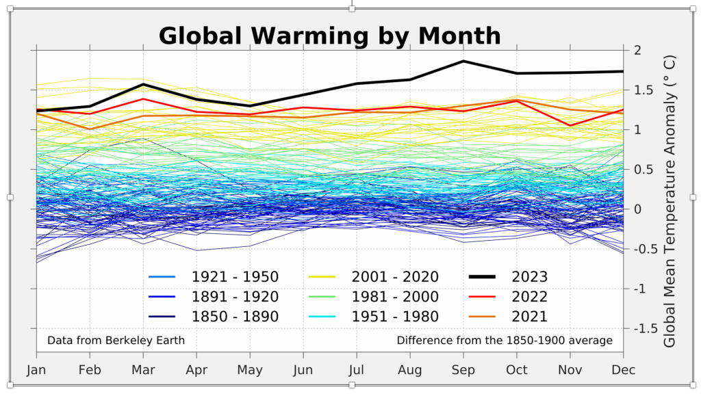 Source: Berkeley Earth, “Global Temperature Report for 2023” posted on Jan. 12, 2024 by Robert Rohde.