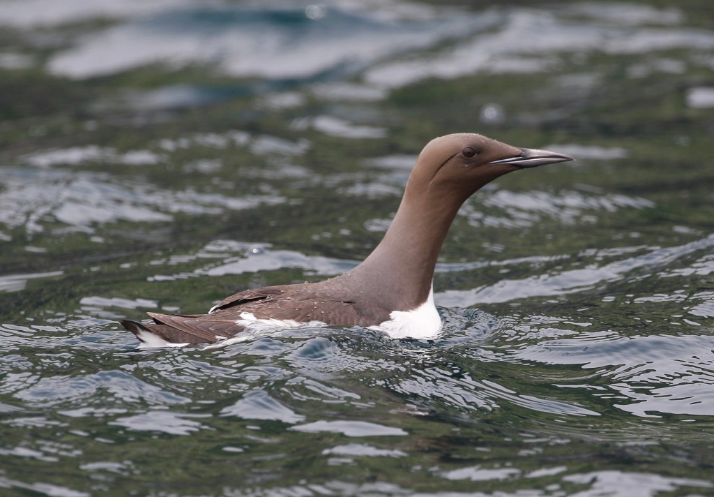 We soon began to see oceanic birds, which, if you’ve birded the coast of New England, have a very East Coast flavor. There were razorbills and guillemots (the latter are called common murres here), relatives of the puffin in the auk family. Huge, gleaming white northern gannets flew overhead, and we watched them fish, plummeting arrow-like, from a great height; they barely made a splash when they hit the water. One of the great ocean wanderers, the black-and-white Manx shearwater, glided low over the waves, wingtips skimming the water. A close relative of the shearwater, the northern fulmar, soared over the ocean on stiff wings. But there were no puffins.