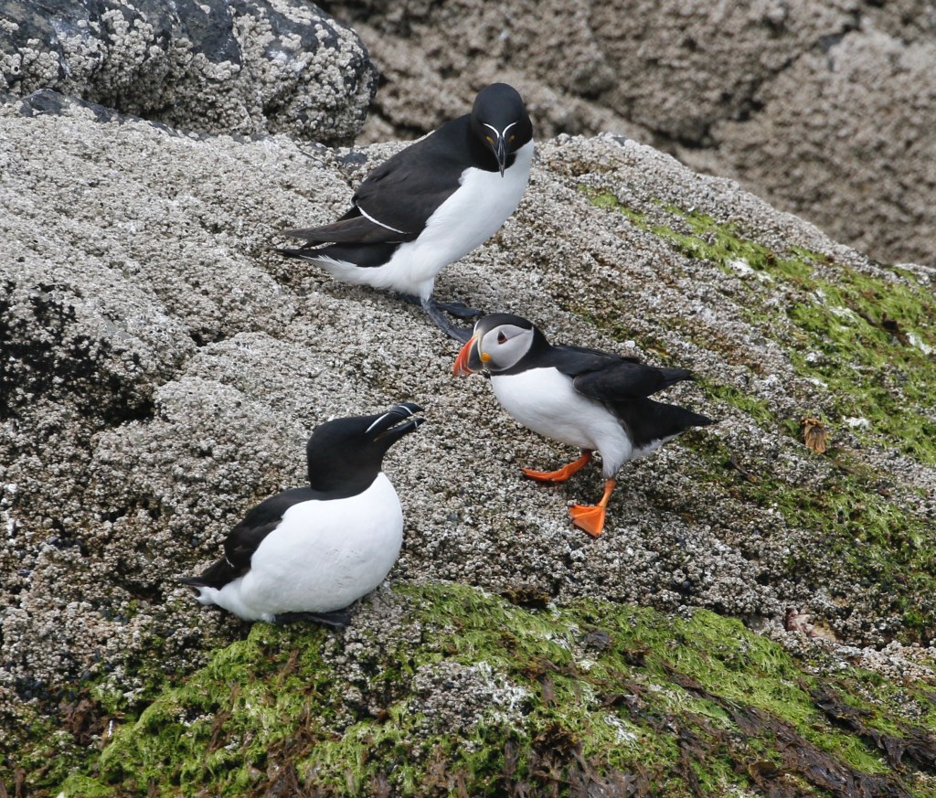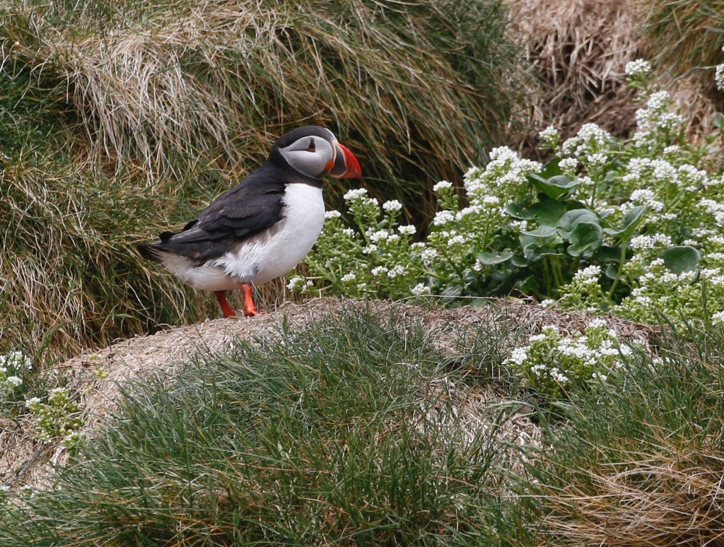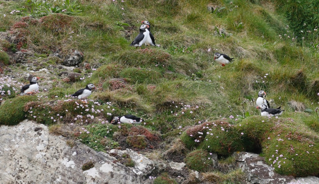 We slowed down in the calmer waters between the two islands, and we were soon surrounded by puffins. They are surprisingly small birds, about 12 inches long, much smaller than the guillemots and razorbills, and they allowed a close approach so that we could admire them even without binoculars. The skipper was able to maneuver the boat close to the cliffs. Above the rocks, among grassy hummocks, the puffins were nesting in burrows that they had excavated themselves; these colonies of breeding puffins are called puffinaries. The skipper told us that we were very lucky with our timing as the parent birds were in the middle of exchanging nesting duties. Hundreds of birds were flying onto the island, greeting their mates at the burrow entrances. We were informed that around 20,000 puffins nest on these islands.