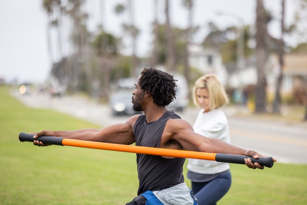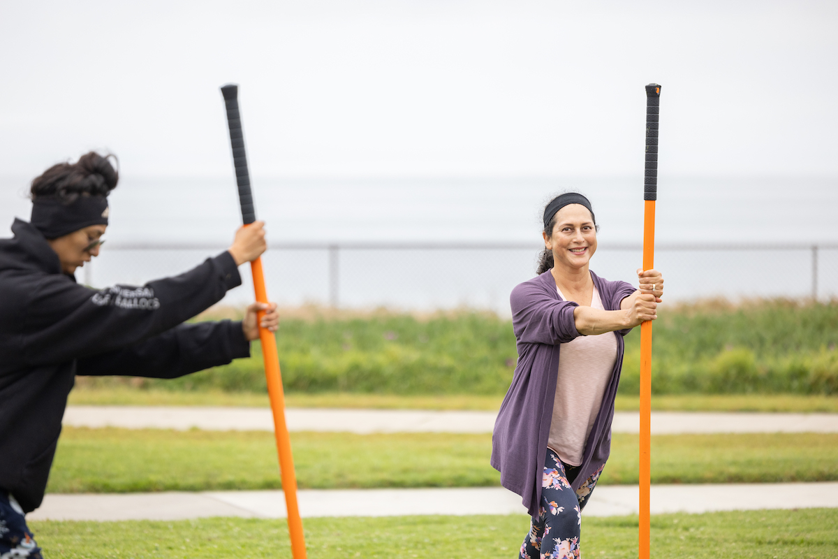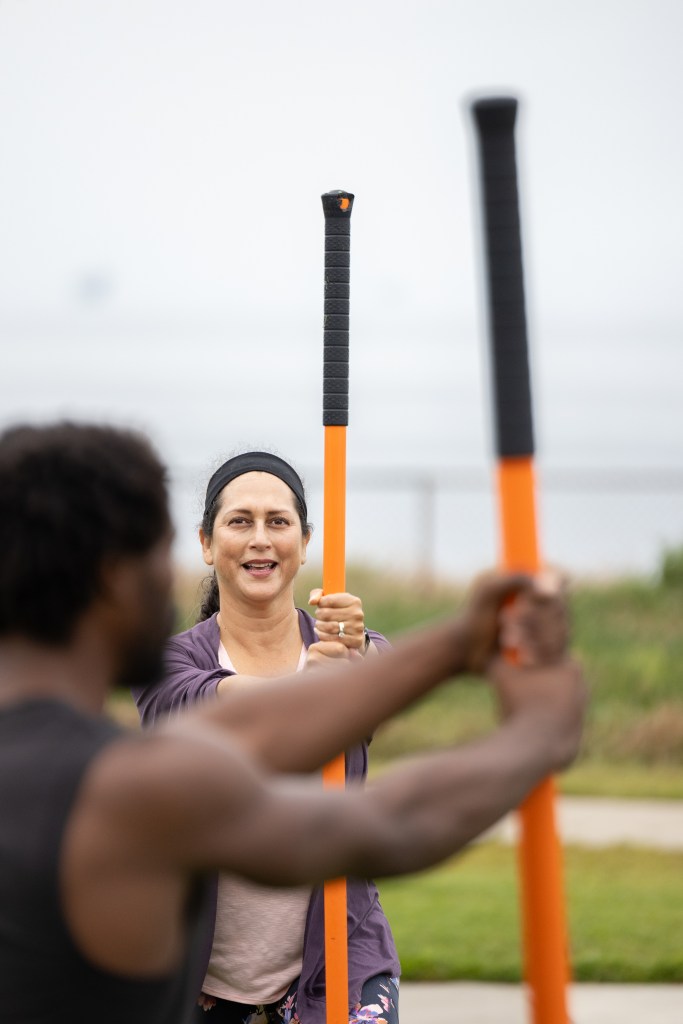 Hayes’s workouts emphasize mobility and functional strength, incorporating a lot of simple but deceptively effective equipment. Participants might start in a circle and toss three-pronged, multicolored HECOstix to each other. HECO stands for “hand-eye coordination,” and Hayes might first have the group catch the lightweight, foam-covered objects by grasping the red prong or blue prong, then toss and catch them right-handed or left-handed, standing on one foot, behind the back, or Kareem skyhook-style. Just when you think you’re getting the hang of it, he’ll have you change directions from clockwise to counterclockwise. It’s a warmup for the brain as well as the body, and both laughter and apologies ring out as the sticks go errant or get dropped.