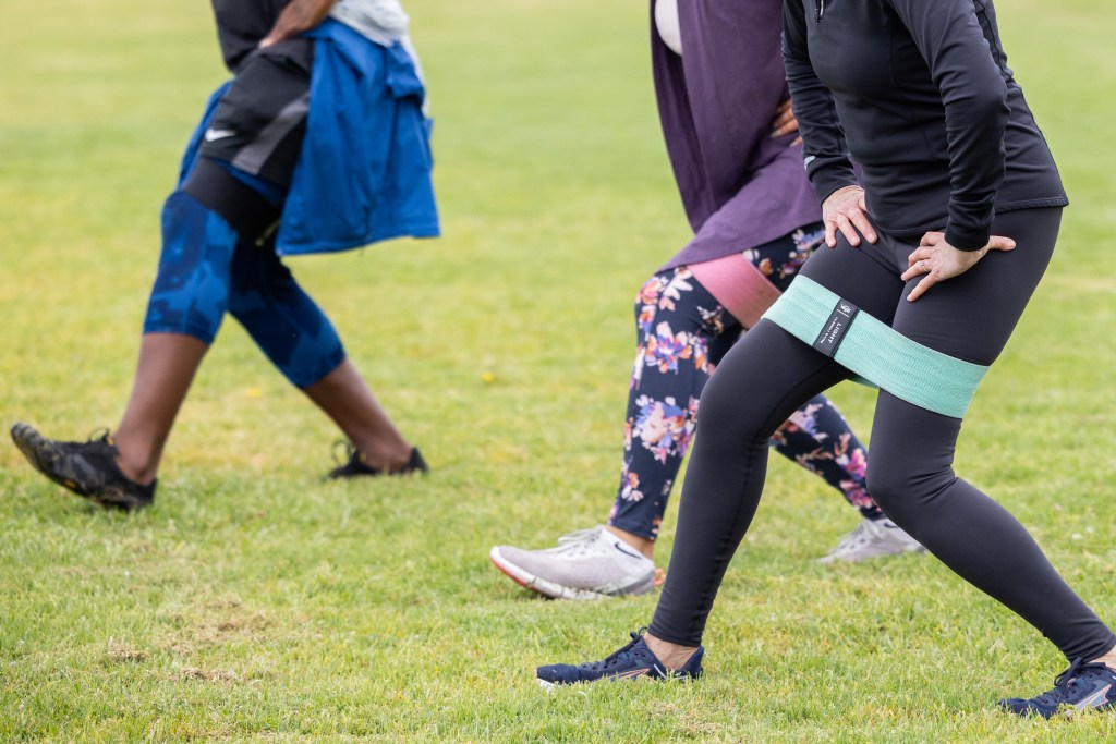 Resistance bands are a classic fitness prop, and Hayes provides nice wide ones made from knitted fabric instead of the rubber ones that roll up and dig into your thighs. I’m sure we looked like Monty Python’s “Ministry of Silly Walks” sketch as we advanced in a straight line, lifting our knees high, resistance bands around our legs above the knee. But the quad workout was no joke.