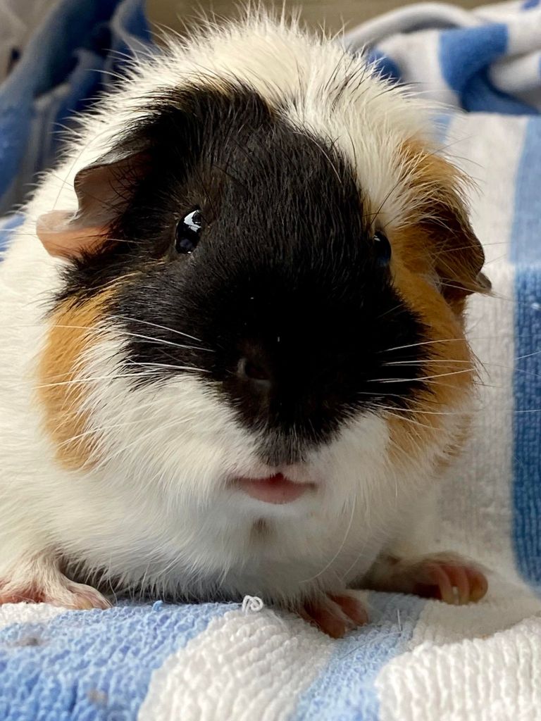 If you want a young guinea-pig with lots of energy and opinions then this boy, Caeden, is for you! He is a sleek and flashy tri-colored American breed. Caeden will keep his new family entertained with his lively, busy-boy antics and explorations! And don’t forget to share the fresh greens, fresh hay and treats!