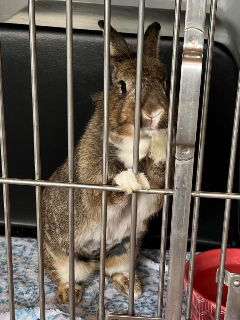 This girl is a sweet teddy bear of a bunny named Osa, or “bear” in Spanish. She loves people and petting and is an easy-going, “roll with it” kind of bunny. We know this because she was found running loose near a school and she went from her original home to a rescuer’s home to BUNS with unusual grace and ease. She has great litter habits, is fine with cats and, beyond this, she has cute and fun coloring and a little tuft of lionhead mane on top of her head. Come meet this very special bunny, Osa!