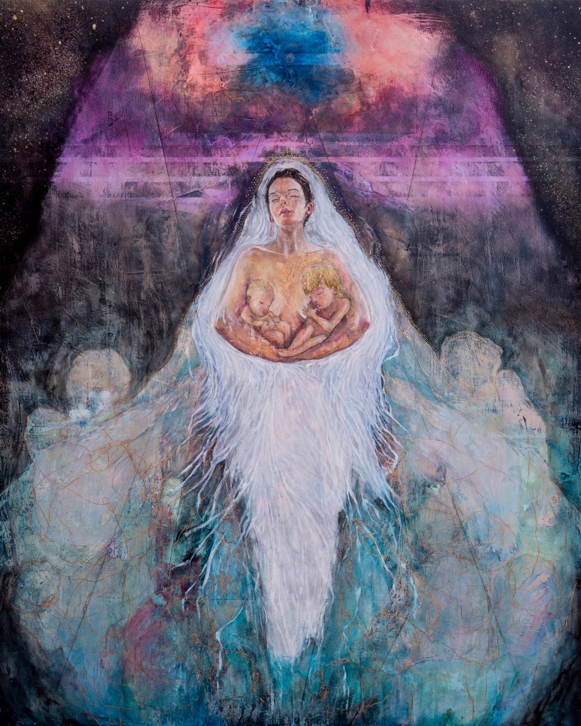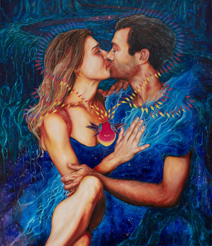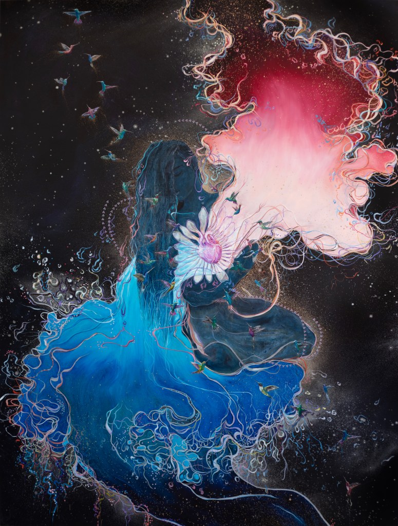 For the next two years, Gleason would continue to paint his lost family, which would be a large part of the processing. He would post his works on social media, and people began to ask him for commissioned pieces. One was a dream translation, and one was a gift for a friend — a work that would include symbols for life phases, and meaningful changes in that friend’s life. Gleason’s style started to organically shift to the more cosmic, more ethereal, transcendent quality that it now possesses. “I’m creating worlds now; it’s all a lot more symbolic.”