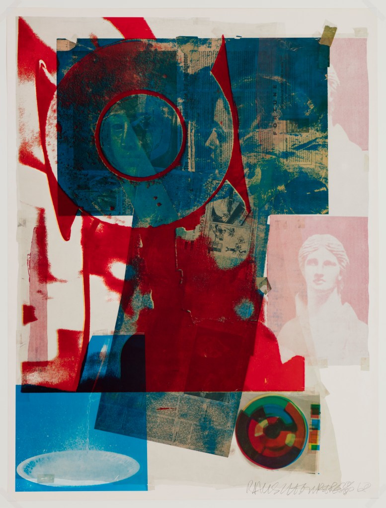 For all the blur effect of his often-nonhierarchical image-stitching, a sense of artistic identity emerges. We know a Rauschenberg when we see one. Such a paradox — a self-expressive style and randomized material-gathering — validates the term “Autobiography,” title of both the show and the epic triptych on view, considered one of his great print works.