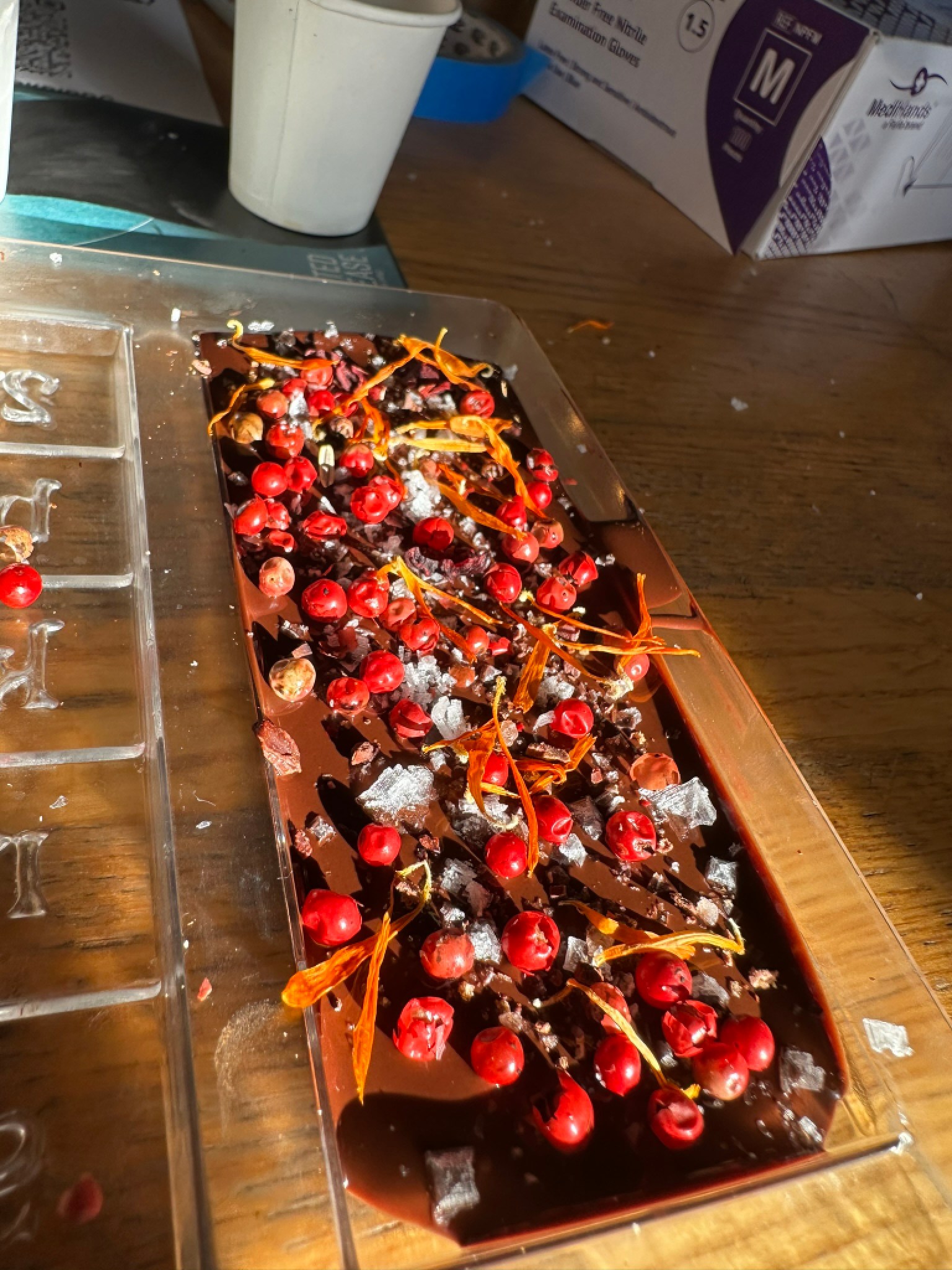 As we wrapped up the pairing, and accepted a few more splashes of wine, our bars emerged from the back, sprinkled in our own selected glories. As most people packed theirs away in the branded wrappers that we were provided, I couldn’t wait. It turns out that, while slightly confusing to the palate, peppercorn, calendula, hibiscus, cocoa nib, sea salt, and fennel taste pretty good together on a chocolate bar. And, you’ll be proud to learn, I haven’t yet eaten the whole thing.