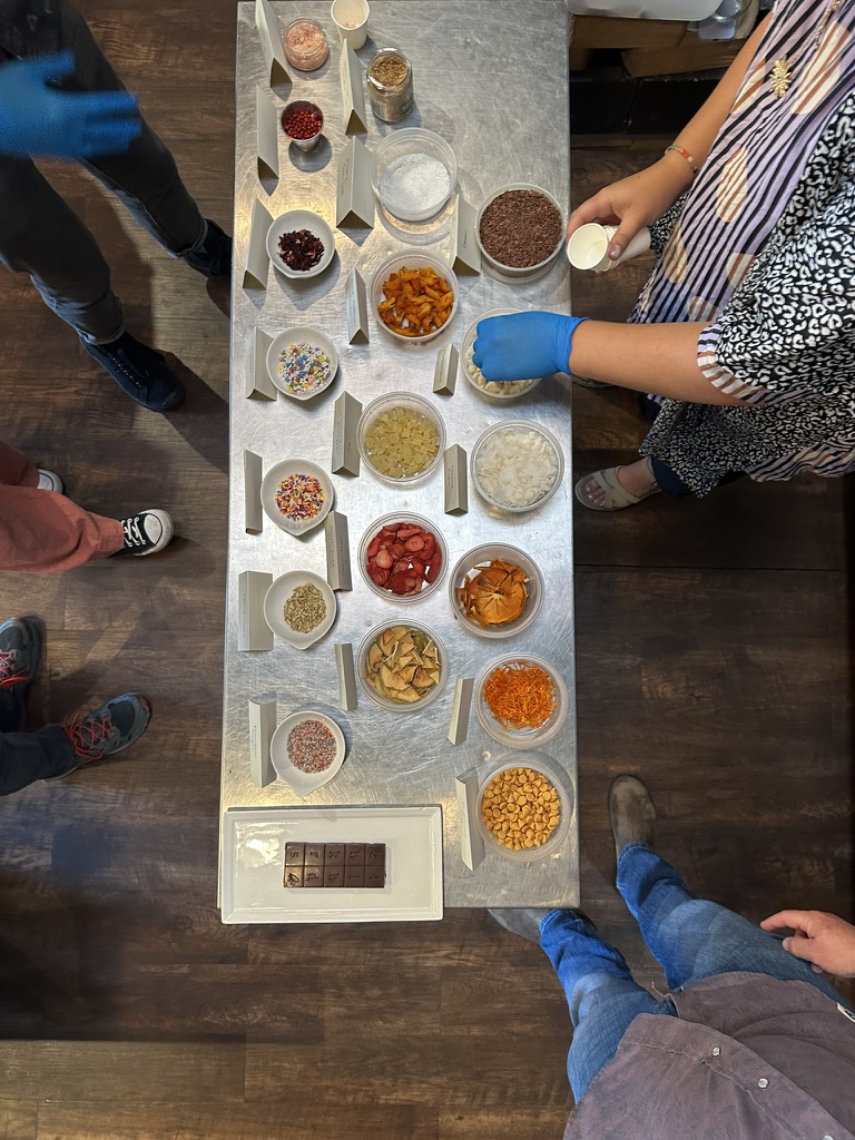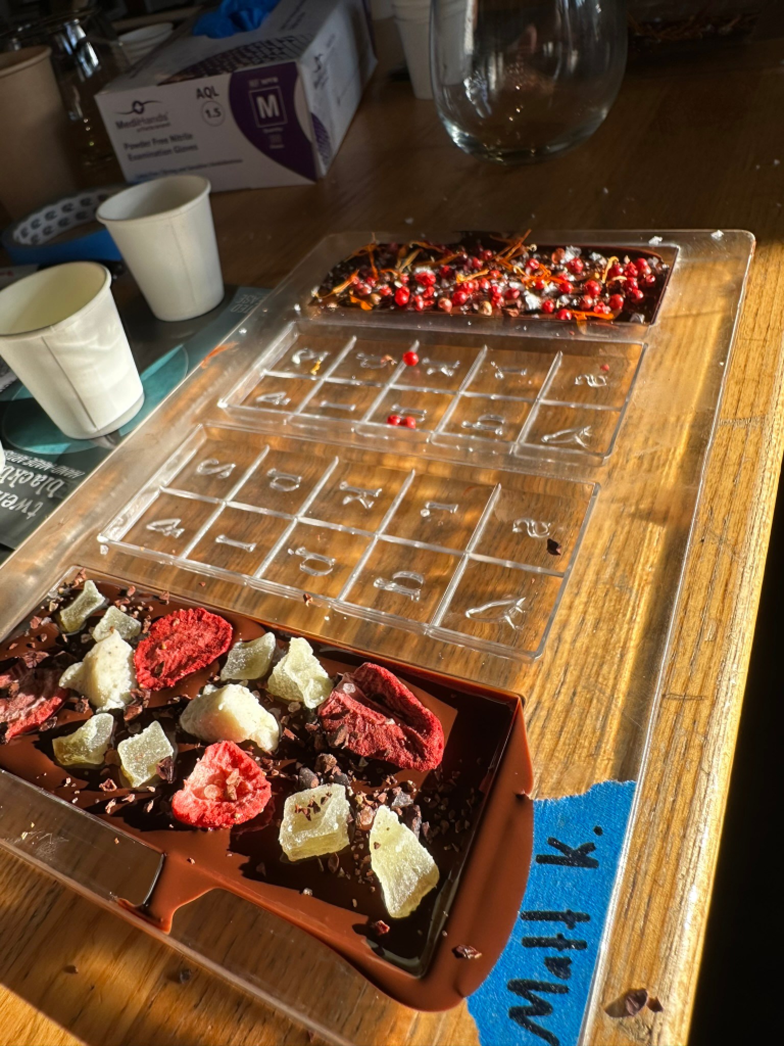 Geena Bouché’s orders to not eat everything right away proved to be the overriding advice during Twenty-Four Blackbirds’ first-ever chocolate-bar-decorating class inside the bean-to-bar manufacturer’s East Haley Street factory last Friday. From the homemade marshmallows and butterscotch chips that we could use as toppings to the melty dark chocolate dolloped into our molds, to those tōgarashi-spiked and espresso-laced truffles of the pairing session, restraint was required for every decision during this hands-on affair.