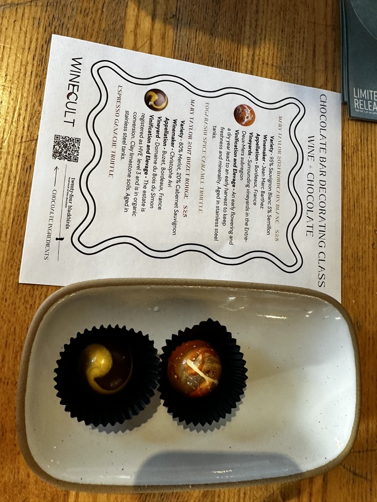 “Everyone take a small nibble,” we are told as our pairing of chocolate truffles and wine begins. “Don’t eat the whole thing!”
