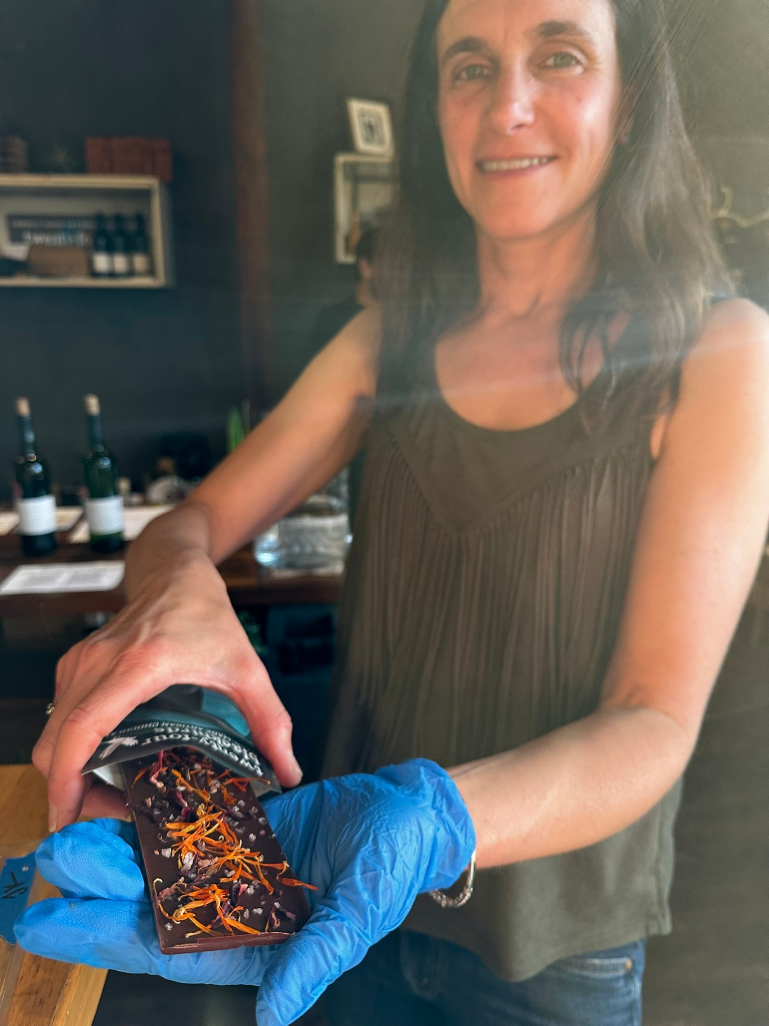 The truffle-wine pairing came as we waited for the bars to chill in the cooler. That put Bouché back in charge, and she explained that the Mary Taylor Wine selections of white Bordeaux and red Buzet from France were made in a négociant style, as Taylor works directly with producers to bottle their wine for import. With the tōgarashi caramel truffle — always one of my faves — we sipped on the sauvignon blanc–based white, then shifted to a merlot-based red for the espresso ganache truffle.