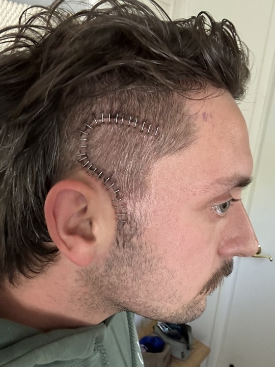 We were talking over coffee at Dune on State Street — well, actually, he was drinking tea, as coffee is generally not recommended for people recovering from brain surgery. Half his head was shaved, showing a new, question-mark-shaped scar.