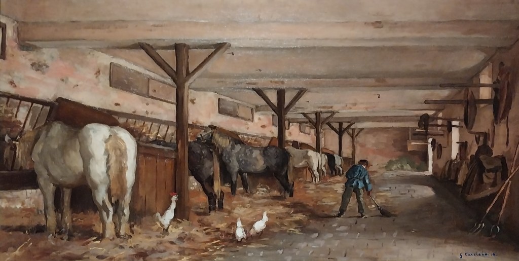 The zone of paintings culled under the curatorial heading of “Factories and Farms” addresses the incursion — or peripheral hum — of urbanization and industrialization on the generally natural and agrarian turf many 19th-century painters focused on. In Gustave Caillebotte’s “The Stable of Champfleury,” circa the 1880s, a low-ceilinged stable exudes a hermetically warm, palpable equestrian ambience.