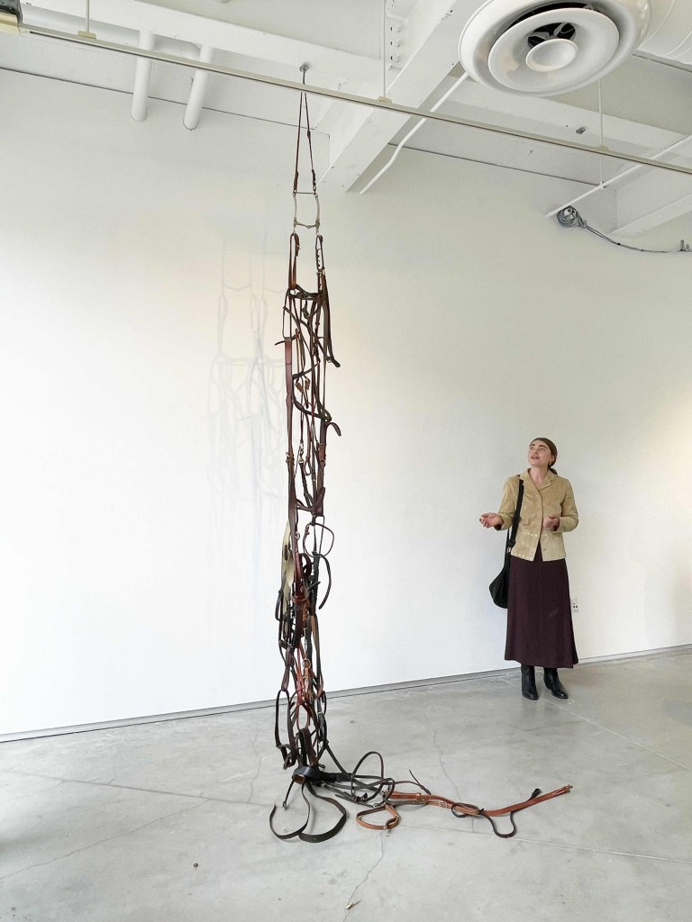 “Everything I come across is a possible resource for a sculpture student to activate,” she said. In this show, students Love and Arroyo repurposed materials from Yasuda’s studio. Love’s suspended sculpture is made with old leather bits and straps from horse bridles that Yasuda gathered from the Hearts Therapeutic Equestrian Center. “The use of the leather in this piece connects with my other work about enclosure and confinement,” Love said. The title “Workhorse (Kim gives Lara permission to goof off)” alludes to Love’s rigorous work ethic with her teacher’s permissive mentoring style.