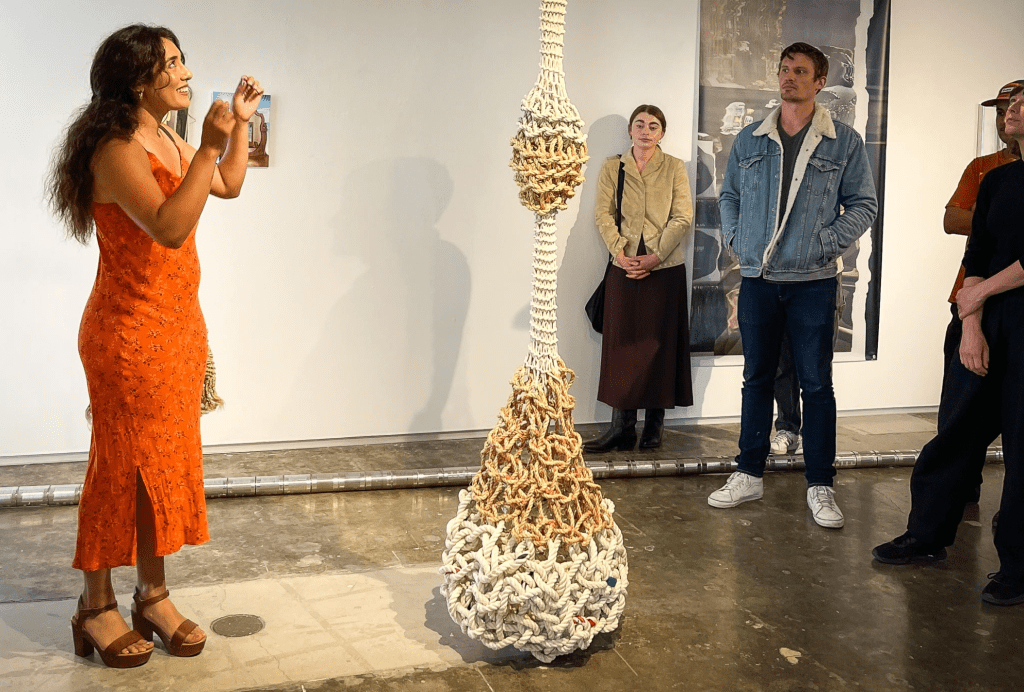 Arroyo’s large crocheted piece “Bunky Mama” is named after Yasuda’s old wooden sailboat and made out of its anchor rope. “On that boat, her daughter learned how to walk,” Arroyo said, noting that she learned to crochet from Yasuda in 2023 and the piece conjured memories of learning the craft from her professor. She also used an assortment of ropes from her stepfather and the Art Department foundry, pieces with their own associated memories.