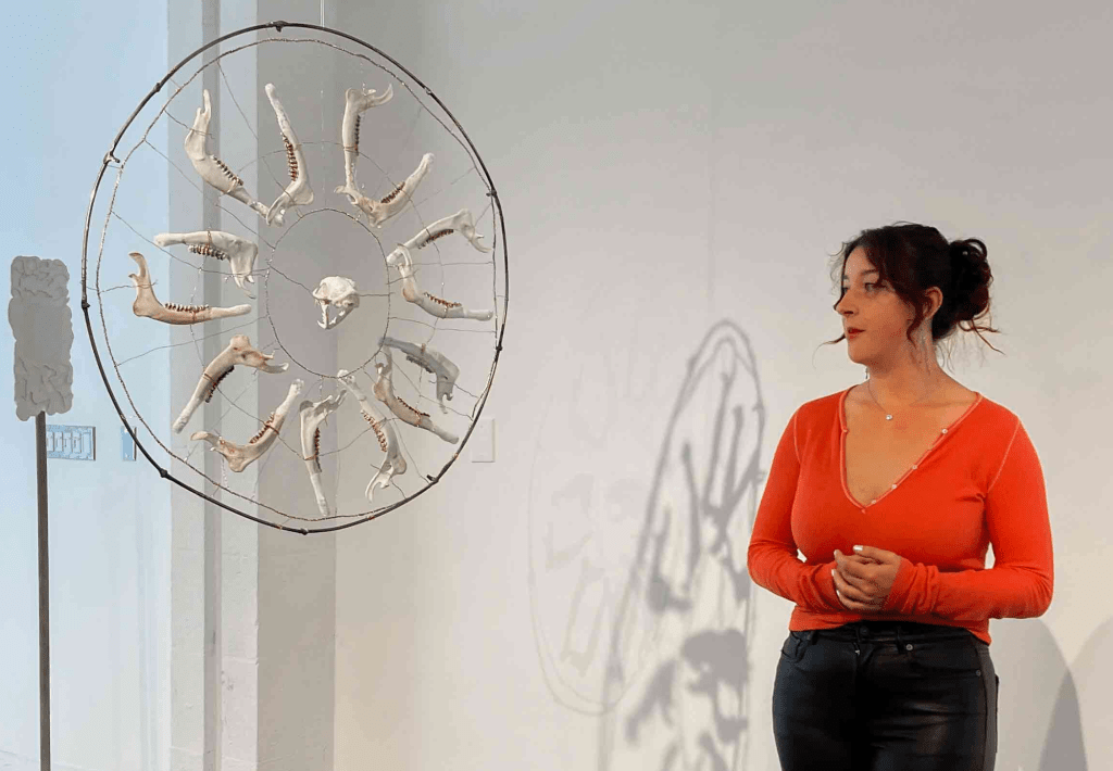 MacMillan’s hanging sculpture “Relic for the Modern Consumer” is made from bobcat skulls and deer jaws from a taxidermist and resembles a clock to mark the passage of time. “In consideration of Catholic relics, which contain the bones of saints and are thought to cause miraculous healing and inspiration of faith,” she said. “I consider the way we honor the lives and deaths of those that touch our lives.”