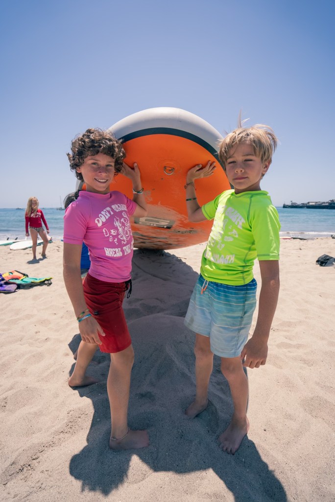 Tuesdays feature tie-dye activities followed by the “West Coast Invaders” beach game on Wednesdays. On Thursdays, the team takes the Mega SUP inflatable paddle board, which has been custom designed for Lobster Jo’s for better safety, under Stearns Wharf to explore marine life. Friday’s activity includes an obstacle course to round out the week. But sprinkled amid the activities are educational lessons about ocean ecology and surf safety, a beach cleanup, and more.