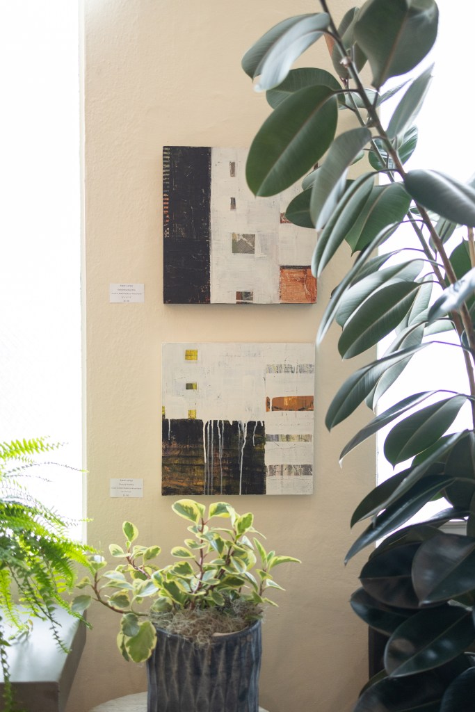And it was particularly challenging given the multiple layers she incorporates into each piece. She worked in multiples, she said, with as many as five going at one time. “They took a really long time to dry because of the Yupo,” she said. “There’s no absorption, and if I used the hair dryer on them to get the paint dry, it would have spread. So, it was paint and wait, paint and wait. And generally speaking, I’m an impatient person, so that was a big lesson for me.”