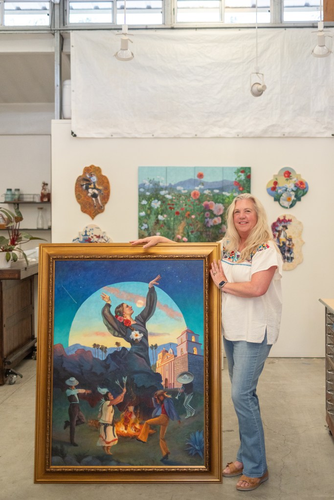 “I ended with the Chumash being the larger flower; it worked on so many different levels. The full moon in the painting is because Fiesta used to be organized around the full moon. I put in the mission because it’s our biggest symbol of Santa Barbara. I wanted to anchor it in Santa Barbara…. And then, in the sky, the North Star, the Big Dipper, also relates to Ernestine DeSoto and in her portrait that I had done at the Natural History Museum; it has that exact constellation. … The rocket launch from Vandenberg is our present and our future. So I wanted to keep on trying to put in some very contemporary things. The century plant, Agave americana, is one I thought was appropriate as well.”