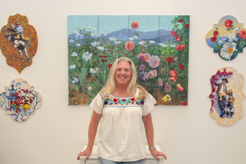 “Who I was painting this for definitely influenced this style. And what was included, because I wanted everybody to be happy,” said Harmon. Aware of the historical significance of Fiesta’s centennial, she said, “The whole town’s watching. I want to give them something that most people can be excited about, embrace, and understand. You know, some of my other work is a little more contemporary than this. I didn’t want people to be like, ‘What am I looking at?’ I did want it to be something that everybody could understand, from a 6-year-old up to a 90-year-old.”