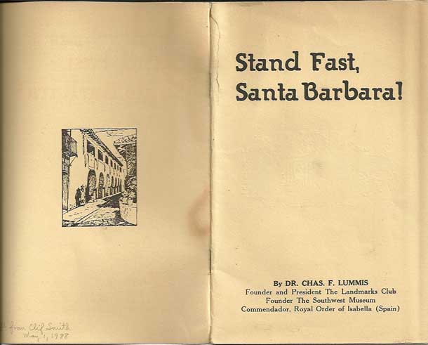 Pearl Chase referred to Charles Fletcher Lummis as “good-looking and considerate, and he knew how to arouse interest in public affairs.” She noted that, “He had the gift of gab and writing, and one of the things which Santa Barbara has cherished has been a speech he made here.”