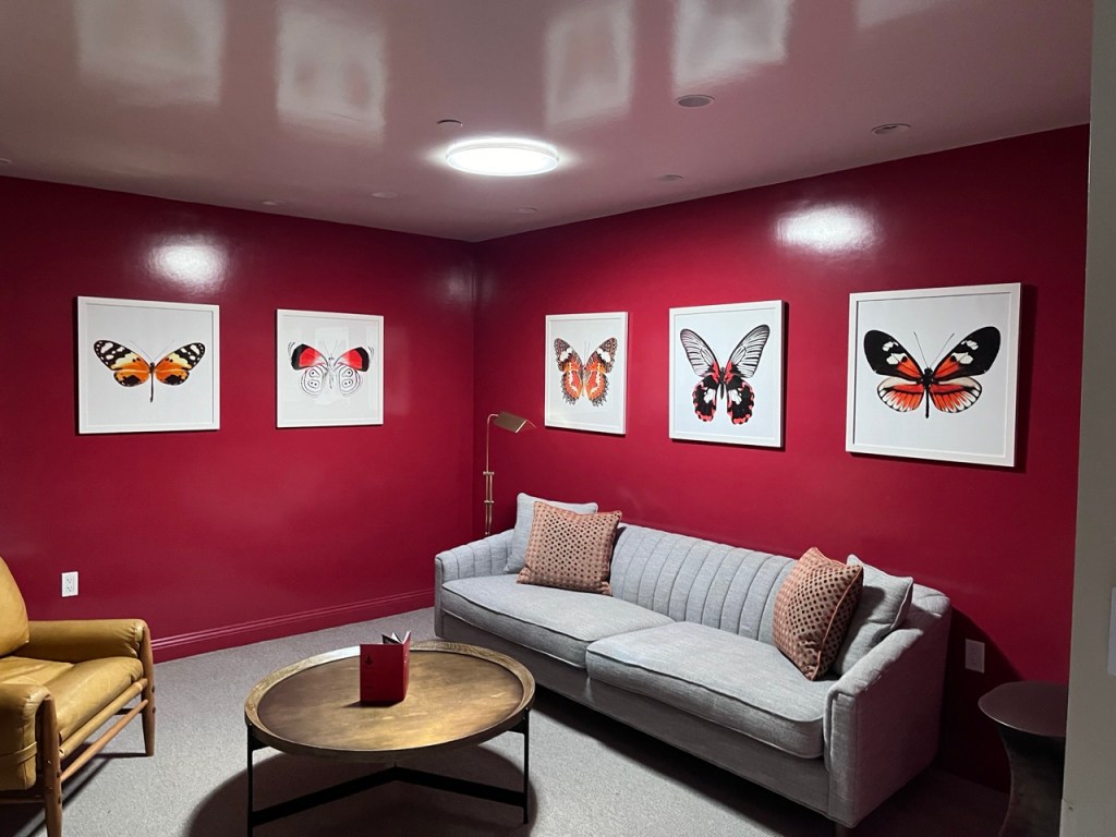 The 14-room Winston Solvang hotel looks like pretty standard Danish-style Solvang architecture from the outside, but once we stepped inside our king-sized suite, I was quite impressed by both the spaciousness and the stylishness of our room. Each room has individual art and decor to appeal to design lovers. For this particular room, the fashion-forward red walls and unique butterfly paintings in the sitting room greeted us, along with a bottle of local wine at the ready. There was also a nicely stocked honor bar available.