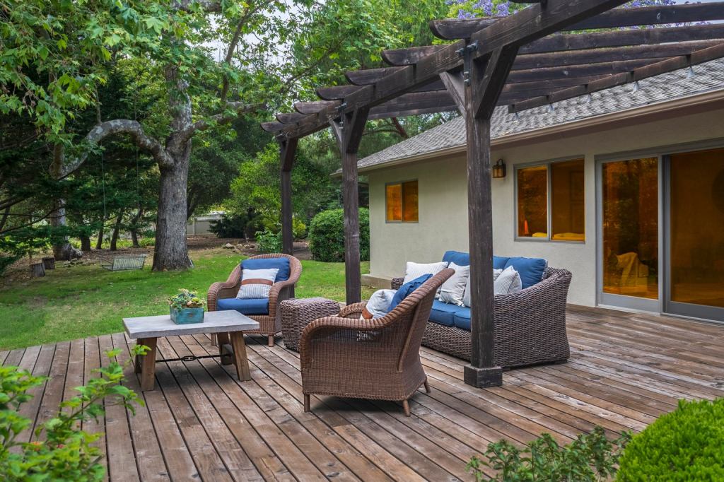 The property at 259 Vereda Leyenda is a four-bedroom, two-bath home in a parklike setting with mature redwood, spruce, jacaranda, sycamore, avocado, and citrus trees, ready to be enjoyed from the back deck shown above. The home is open today from 1-4 p.m. Visit Gabe Grandcolas and experience its natural vibe yourself.