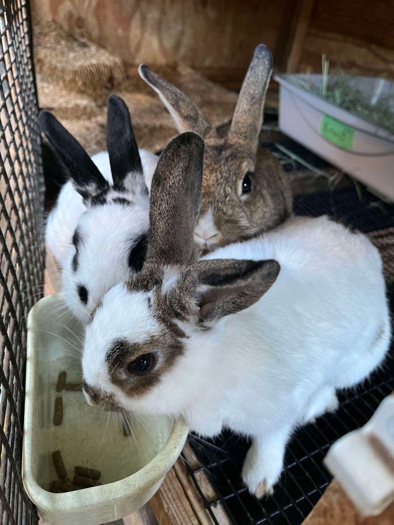 These lovely lady bunnies, also known as “The Fruit Girls,” are y oung and sweet and oh-so-cute! Miss Nectarine, the white one with brown ears, is mama to her 2 daughters, Guava, the mostly brown agouti and Cherry, the black and white bun. They get along very well so could be adopted all together, or one could be taken out to bond with a single bunny who is looking for a companion. They are small in size and have excellent litter habits, so come meet this precious trio!