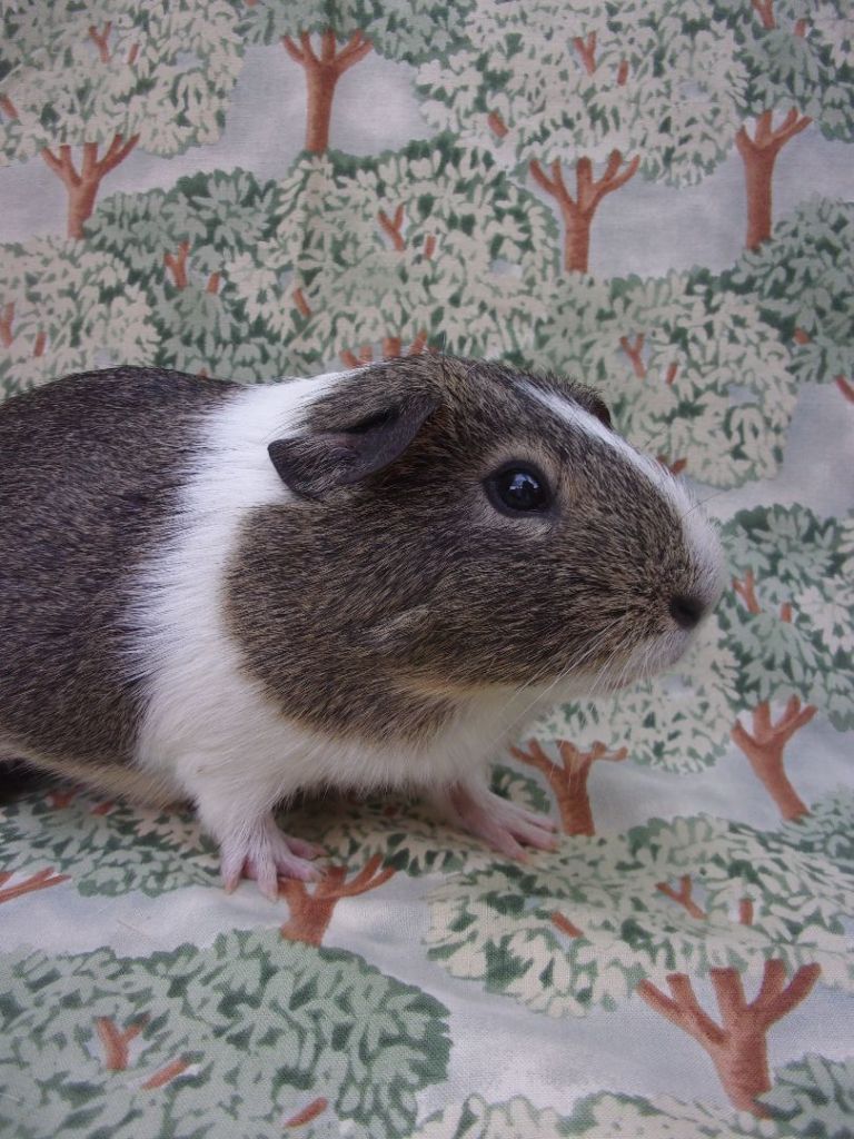 This handsome male guinea pig is white with attractive brown brindle patches and he will check you out with two beautiful bright eyes. He was brought to BUNS because he did not care to bond with the family cat, but he was said to be a very good fellow, and we at BUNS agree. He is shy but very gentle and will warm up to anyone with a soft, comfy lap and some fresh greens to share.