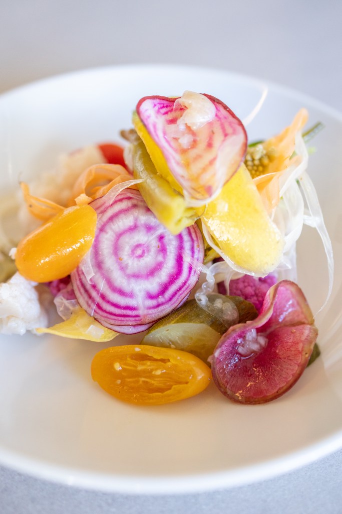 The food sings with the sophisticated yet playful notes of French Bistro fare. No visit would be complete without ordering the “Presidio Picnic,” which includes olives beaming with orange zest and Santa Ynez Olive Oil, Riviera Bread sourdough with the aforementioned addictive butter, and delectable saucisson (thinly shaved sausage). The pickle plate is a feast for the eyes as well as the belly. Made from a selection of seasonal veggies that the chef hand-picks from the farmers’ market each week, our particular iteration was a stunning tableau of purple cauliflower, yellow and green candy-like tomatoes, green kohlrabi, and more.