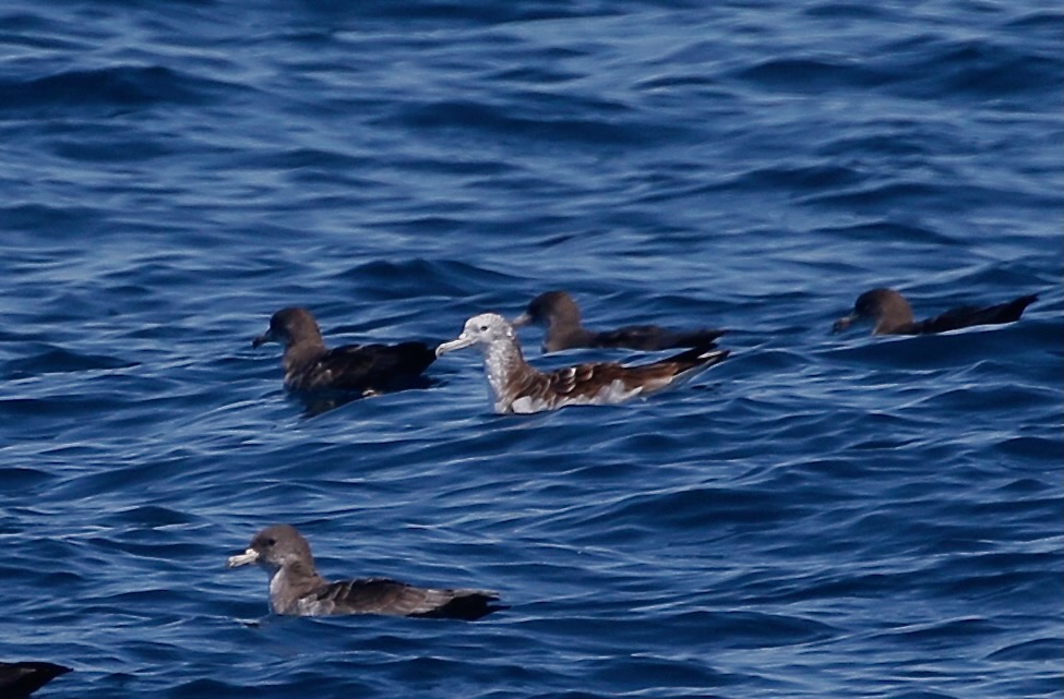 We spent the next 20 minutes anxiously scrutinizing flocks of shearwaters, and then finally someone called out that they had found it. It was difficult to make out at first, as the shearwaters were distant and kept disappearing behind the swells, but finally all on board had seen the streaked shearwater well enough, with its distinctive white head and bill. Many of us conjectured that it could be the same individual as the one seen two years ago, but we’ll never know for sure.