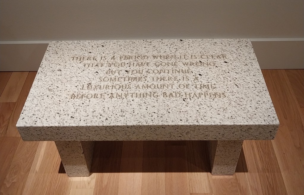 For deft comic relief, we have a welcome blast of the word-based dry humor of Jenny Holzer — whose art has graced SBMA at various times over the decades, through “silent radio” pieces and more. In this case, her language gaggery takes the sly form of extended text on a marble bench such as we’d find in a cemetery. The text is also the work’s title, from The Living Series: “THERE IS A PERIOD WHEN IT IS CLEAR THAT AYOU HAVE GONE WRONG BUT YOU CONTINUE. SOMETIMES THERE IS A LUXURIOUS AMOUNT OF TIME BEFORE ANYTHING BAD HAPPENS.”