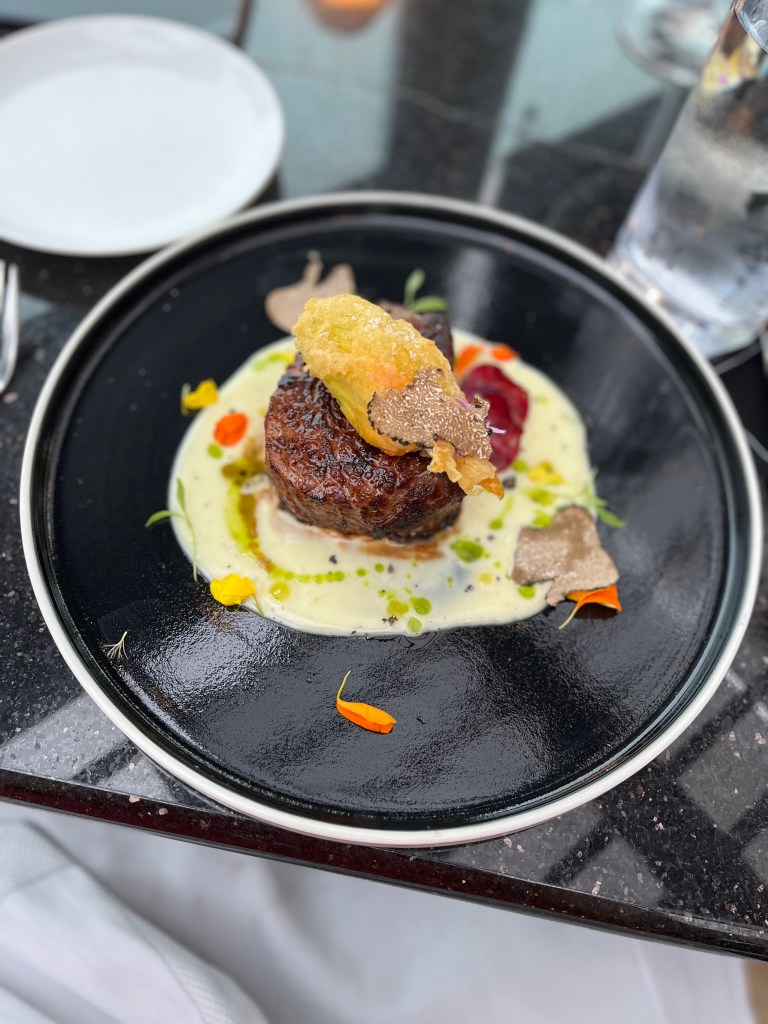 Angel Oak is known for its steakhouse experience, and our second course showcased just that, with a perfectly prepared eye of ribeye complimented with a broken citrus beurre blanc sauce, a stuffed zucchini blossom with very fresh goat cheese, and a summer truffle crème fraîche . Divinely decadent!